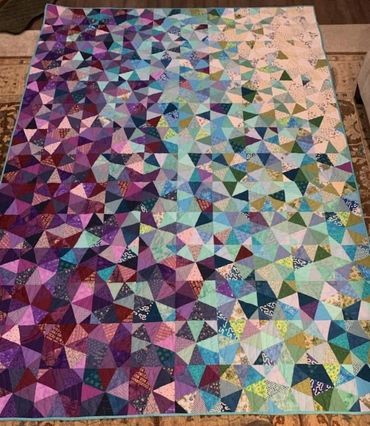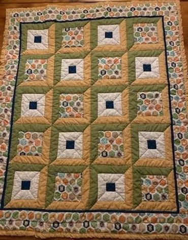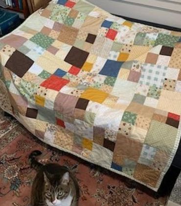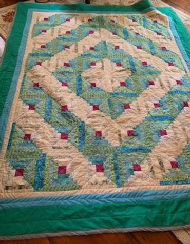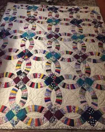 Answer: “Quilting is a way for me to celebrate those I love. My first quilt was a wedding ring quilt for my niece's wedding using scraps of fabric from my mother's craft stash which I inherited upon her death. Using the left-over fabrics from my mother’s projects, allowed her to be part of the quilt as well. Since then, I have made a quilt for my husband, 2 baby quilts to welcome new family members, a wedding quilt for my son and daughter-in-law and I just finished a quilt for my daughter which took 2 years. I plan on making a military themed quilt for my brother as my next project. “